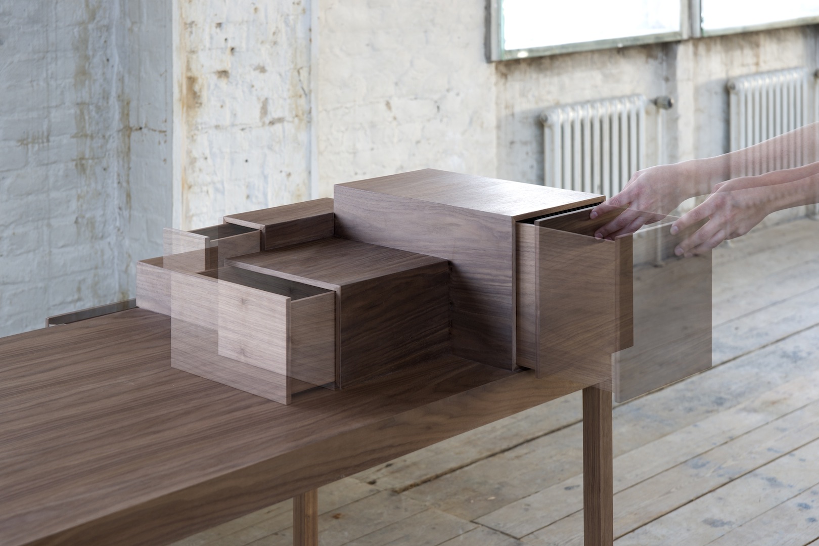 On the other side, LISTEN TO YOUR HANDS is a strange desk with lots of drawers on it. When you open and close one of drawers on this desk or from the side quickly, the other drawer opens. He creates a scene in which drawers push and pull each other, using air pressure. When you see this desk, you naturally start to think of old slapstick comedy film scenes. When you push a drawer, the other drawer will pop out and strike a head of a main character or an evil. The approach in this desk design is similar to MECHAIR. He still seems to strongly believe in “harmonious combination of function and form.” When it says ‘function’ here, it means the pleasure of immediate response, coming from touch screens of smart devices. In other world, Lee is trying to ‘reenact’ the response of touch screens through a material form of furniture. As a result, we get to see a structure of cuboids, architecturally displayed, borrowing a form of drawers on a desk.